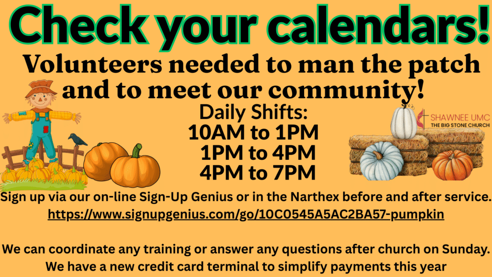 Check your calendar and sign up to work the Pumpkin Patch. Shifts are 3 hours. Training will be provided if needed.