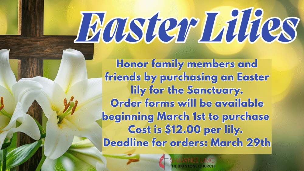 Honor your loved ones by ordering an Easter lily for the Sanctuary. Easter Lilies will be available to order beginning March 1st. Cost is $12.00