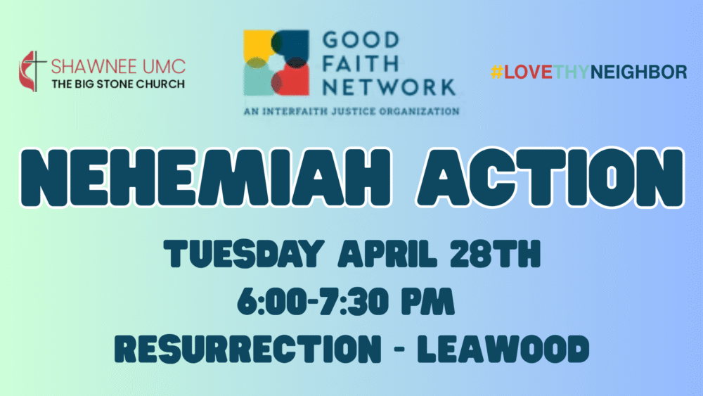 SUMC is now a member of the Good Faith Network, an interfaith justice organization that organizes and uses that voice to advocate for changes that address the root cause of our community's most pressing problems. Come join us in representing SUMC on Tuesday, April 28th at Resurrection Leawood 6-7:30 for Nehemiah Action. We will be advocating for mental health crisis care, ending homelessness, lack of affordable housing and eldercare, aging in place