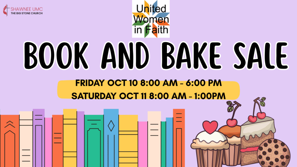 Join us for our United Women in Faith Book and Bake Sale. Friday October 10th from 8-6 and Saturday October 11th from 8-1
