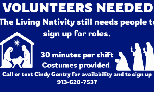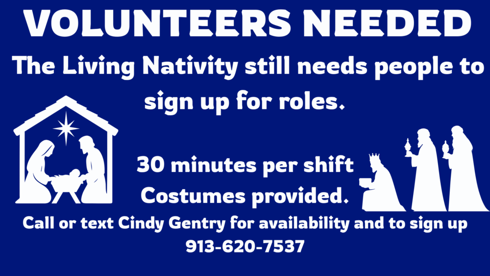 We are still looking for people to sign up for living nativity roles on Sunday 12-21-25. Shifts are 30 minutes and costumes are provided. Bring your whole family or grab some friends as we continue this beloved community tradition. To sign up, call or text Cindy Gentry 913-620-7537 for availability.